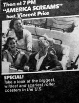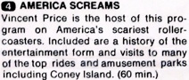 AMERICA SCREAMS is the 60 minute, award-winning television special starring Vincent Price, syndicated and broadcast worldwide; also currently available from Amazon and Rhino Home Video.